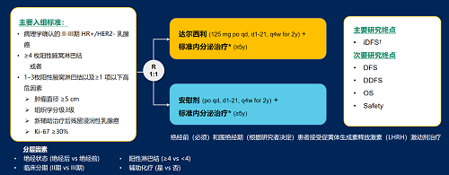 达尔西利(Dalpiciclib)是AG真人医药自主研发的口服、选择性的小分子CDK4/6抑制剂,也是中国首个自主研发的新型高选择性 CDK4/6 抑制剂,已证实其与内分泌治疗(ET)联合用于 HR+/HER2- 晚期乳腺癌的一线和后线治疗时,均显著改善无进展生存期(PFS)6,7。因此开展了一项随机、双盲、III期临床试验(DAWNA-A),以进一步评估达尔西利联合内分泌治疗作为高危早期 HR+/HER2 - 乳腺癌辅助治疗的效果。本研究纳入高危复发风险人群需满足以下标准之一:①≥4 枚阳性腋窝淋巴结;②1–3枚阳性腋窝淋巴结且合并≥1 项高危因素(肿瘤直径 ≥5 cm,组织学分级3级,辅助治疗后残留浸润性乳腺癌,Ki-67 ≥30%)。本文呈现预先设定的首次中期分析(IA1)结果。